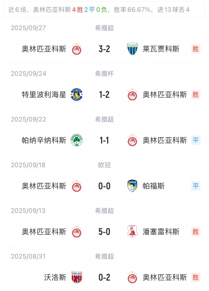 阿森納首輪2-0客勝畢爾巴鄂,奧林匹亞科斯0-0戰(zhàn)平帕福斯。阿森納與奧林匹亞科斯此前在歐戰(zhàn)共交手12次,打成6勝6負(fù)。兩隊上一次交手是2020/21賽季歐聯(lián)杯1/8決賽,阿森納兩回合3-1、0-1淘汰對手。