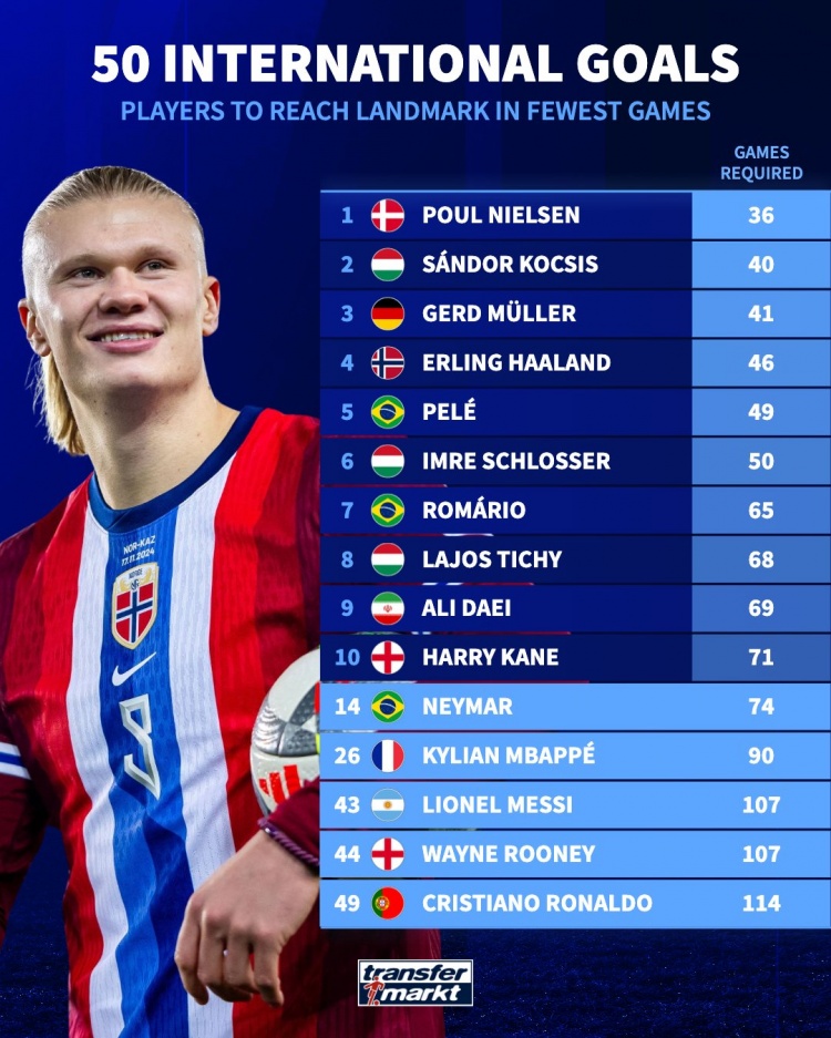 10月13日訊 在上周對陣以色列的世預(yù)賽中,哈蘭德上演帽子戲法,這讓他成為歷史上第4快打入國家隊第50球的球員。作為對比,梅西用了107場才達到這一里程碑,而C羅則用了114場。德轉(zhuǎn)列出了達成國家隊50球所用場次最少的球員?。